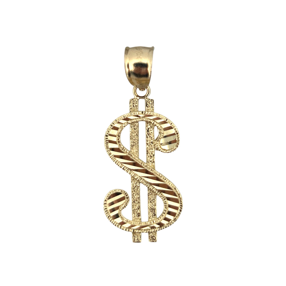 This dollar sign pendant features a 10K gold tone finish and a detailed textured design. Measuring approximately 1.5 inches, it offers a defined look suitable for pairing with many types of chains. The pendant’s structured shape and decorative accents make it a versatile accessory for different jewelry combinations and personal styles.