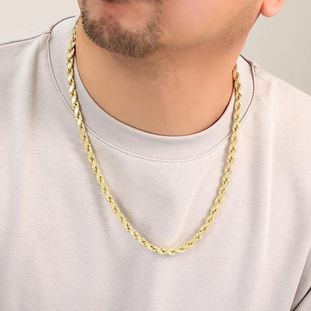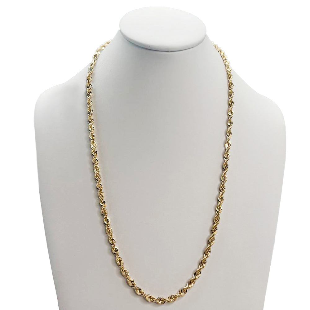 Enhance your jewelry collection with this refined rope chain, made from 10K gold. The chain features a timeless twisted design that provides a unique texture and radiant shine. Crafted from durable 10K gold, it ensures a luxurious appearance and long-lasting wear. The chain's substantial weight and elegant design make it a versatile accessory, suitable for both casual and formal outfits, adding a sophisticated touch to any ensemble.